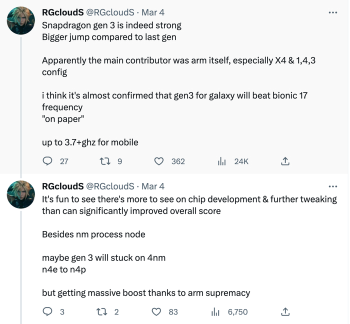 据分析师 RGcloudS 透露,骁龙8 Gen3很强大,与上一代相比更大的升级显然主要贡献者是Arm本身、尤其是Cortex-X4超大核和1+4+3结构,其还认为骁龙8 Gen3 For Galaxy版或许将击败苹果A17的频率,主频可能高达3.7Ghz。对比骁龙8 Gen2上的Cortex-X3 3.2Ghz频率提高了约15%。