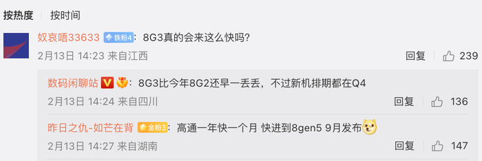 至于骁龙8 Gen3何时登场,早前爆料达人数码闲聊站表示:骁龙8 Gen 3比骁龙 8 Gen2的发布时间(11月16日)还早一丢丢,不过新机排期仍然是今年第四季度(10-12月)。或许最快10月份发布,供大家参考。