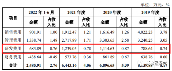 2019年至2022年上半年,索宝股份的研发费用投入分别为788.64万元、1114.63万元、1239.05万元和683.89万元,占营收的比重分别为0.74%、0.87%、0.78%和0.76%。