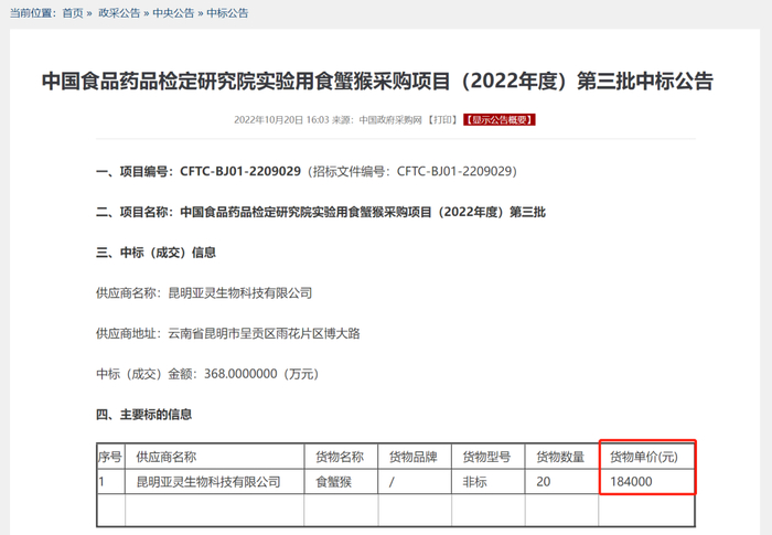 2022年10月中检院公布实验用食蟹猴采购项目年度第三批中标结果,由昆明亚灵生物拿下,总量20只,平均单价达到18.4万/只。