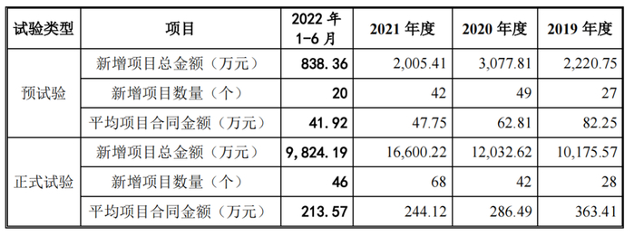 临床研究部分,万邦医药主要提供生物等效性服务分为预实验和正式试验。2019--2021年及2022年1-6月,公司预试验平均项目合同金额分别为82.25万元、62.81万元、47.75万元以及41.92万元;正式试验平均项目合同金额为363.41万元、286.49 万元、244.12万元以及213.57万元,整体呈下降趋势。