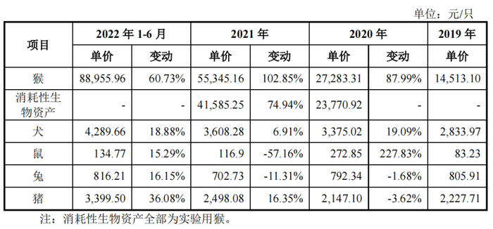 据万邦医药的招股书显示,公司采购一些特殊类型的小鼠,主要是转基因鼠、野生小鼠和荷瘤鼠(该类小鼠单价较高)。剔除后,2019年至2022年上半年的鼠采购单价分别为65.27元/只、72.47元/只、75.24元/只和76.6元/只。