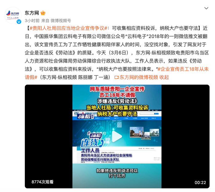 中国振华集团云科电子宣传员工“18年从不请假”“饿出胃病”?企业回应,当地人社局:纳税大户也要按法律来
