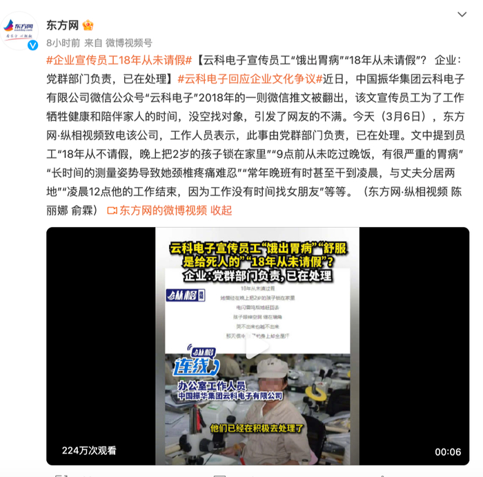 据东方网报道,近日,中国振华集团云科电子有限公司微信公众号“云科电子”2018年的一则微信推文被翻出,该文宣传员工为了工作牺牲健康和陪伴家人的时间,没空找对象,引发了网友的不满。3月6日,东方网·纵相视频致电该公司,工作人员表示,此事由党群部门负责,已在处理。