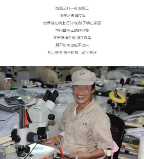 上述微信推文中提到,员工“18年从不请假,晚上把2岁的孩子锁在家里”“9点前从未吃过晚饭,有很严重的胃病”“长时间的测量姿势导致她颈椎疼痛难忍”“常年晚班有时甚至干到凌晨,与丈夫分居两地”“凌晨12点他的工作结束,因为工作没有时间找女朋友”等等。