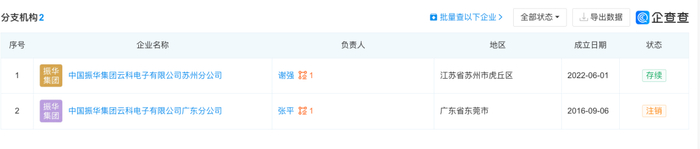 该公司共2家分支机构,目前仅存续1家,为中国振华集团云科电子有限公司苏州分公司。