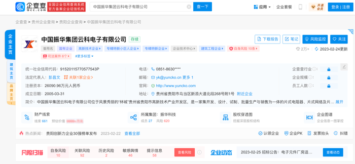 企查查APP显示,中国振华集团云科电子有限公司成立于2005年,法定代表人为彭昌文,注册资本2.61亿元人民币,由中国振华(集团)科技股份有限公司全资控股。