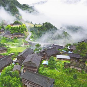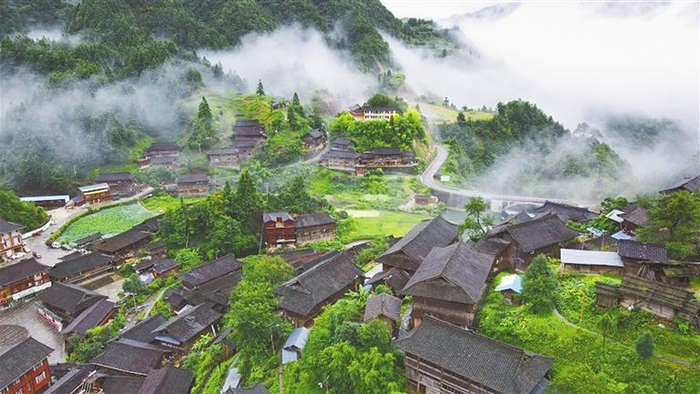从雷山县城驱车沿雷公山盘山公路蜿蜒而行,一路上云海翻腾,白雾氤氲。40分钟后,隐藏在雾霭中的苗族村寨出现在眼前。