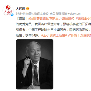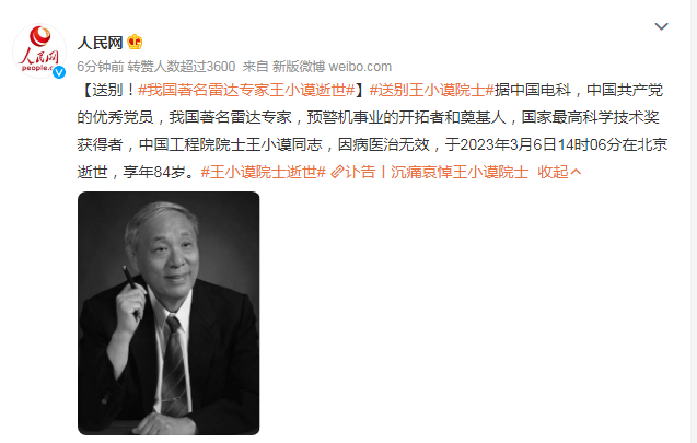 据中国电科微信公众号等消息,我国著名雷达专家,预警机事业的开拓者和奠基人,国家最高科学技术奖获得者,中国工程院院士,中央直接联系的高级专家,原电子工业部第38研究所所长,原中国电子工业总公司军工局局长,原信息产业部电子科学研究院常务副院长,工业和信息化部电子科技委原副主任,中国电子科技集团有限公司科技委原副主任王小谟同志,因病医治无效,于2023年3月6日14时06分在北京逝世,享年84岁。