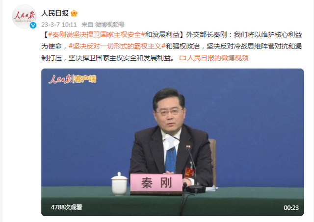 外交部长秦刚:坚决捍卫国家主权安全和发展利益
