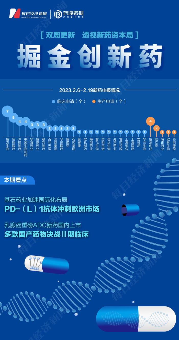 2023年2月6日至2月19日期间,上市公司方面,康方生物提交7个临床申请;恒瑞医药提交5个临床申请;泽璟制药、中国生物制药各提交4个临床申请;华海药业、康缘药业、联邦制药各提交3个临床申请;百利天恒、汉商集团、华东医药、康诺亚、石药集团各提交2个临床申请;奥赛康、歌礼制药、海创药业、华兰生物、吉贝尔、上海医药、上海谊众、首药控股、先声药业、信达生物、药明巨诺、智飞生物各提交1个临床申请。