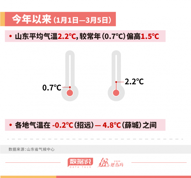 今年以来(1月1日—3月5日),山东平均气温2.2℃,较常年(0.7℃)偏高1.5℃,各地气温在-0.2℃(招远)—4.8℃(薛城)之间。东明(3.8℃)、鄄城(3.7℃)、梁山(3.5℃)等7站为本站历史同期次高,济宁(4.2℃)、济南(4.0℃)、郓城(4.0℃)等18站为第3位高值。