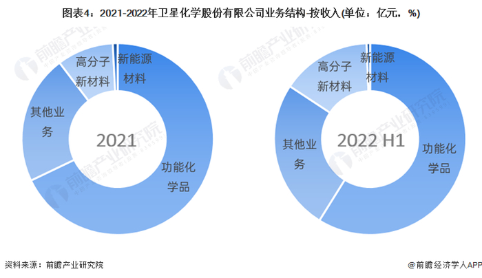 从收入结构来看,公司主营业务收入主要来源于功能化学品、高分子新材料、以及新能源材料。其中功能化学品是公司主营业务收入的主要来源(2021年占比为67.9%;2022年上半年占比为58.86%)。