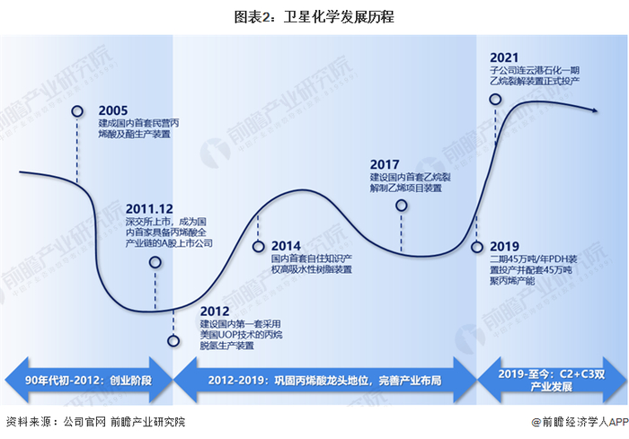 总体而言,卫星化学的发展历程可以划分为三个阶段。第一阶段为公司创立至2012年:期间,公司从高分子乳液起家,2005年建成国内民营首套丙烯酸及酯装置,2011年底成为国内首家具备丙烯酸全产业的A股上市公司;第二阶段为2012-2019年,期间公司不断完善上下游产业链布局,巩固丙烯酸行业龙头地位;第三阶段为2019年至今,公司横向延伸,依托优势原料平台逐步形成C2+C3双产业链布局。