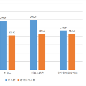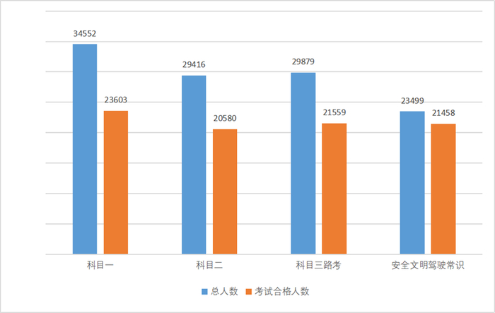 各科目考试合格率分别为:科目一68.31%;科目二69.96%;科目三实际道路考试72.15%;科目三安全文明考试91.31%。