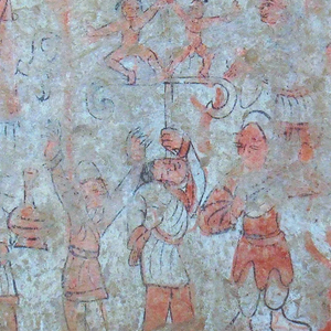 宴饮图的东侧壁画是一幅杂耍乐舞图,保存较完整。底部是着白色交领条纹袍服、红色裤的托举者,头歪着,左肩承托着一个竖直的“十”字形杆柱,左手紧抓杆柱。往上在杆柱的下部有两个穿着紧身衣的小孩;杆柱中部一人沿杆向上攀登,他的两侧各有一位在空中翻腾的表演者;杆柱顶部有一人仰身向上,双臂舒展。这些杂耍形象与同时期宋绍祖墓中出土的杂技俑有异曲同工之妙。举杆人身后一人头戴高帽、身穿淡红色窄袖交领短袍,似为喝彩者。举杆人前方有一手执琵琶者,头戴白色小帽,上身穿红色紧身袍衣,衣摆下部呈波浪形弯曲,下着白色裤子和毡靴。此人身后的两个人物形象,一人似吹奏乐器,一人似拱手而立,因破坏严重不易看清。杂耍乐舞图东侧最上部为四个头戴尖帽、身着紧身衣的舞者,均为双手伸开,一脚后翘,单腿站立。在四人下方站着三个人,隐约可见西侧者深目高鼻,着白色短袍腰系红带,似双手张开;中间者面庞丰润,手中似有乐器;东侧者头梳后翘的小辫,身着浅绿色圆领短袍,拱手而立。