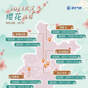 据湖北省气象服务中心发布的最新樱花预报,预计2023年武汉樱花初花期略偏早,与2022年基本一致。