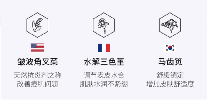 为此,肌肤之食这款洗面奶还添加了三种草本提取物护肤成分——皱波角叉菜、水解三色堇以及马齿苋。