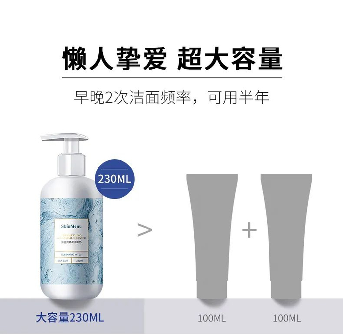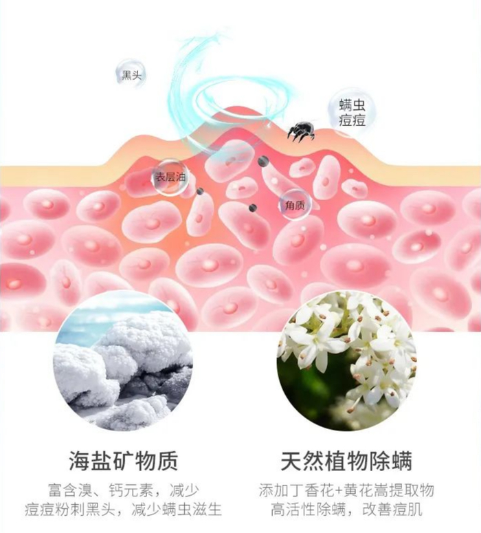 关键的步骤就是除螨,这款洗面奶通过海盐+植物双萃,对我们脸上的螨虫进行去除。