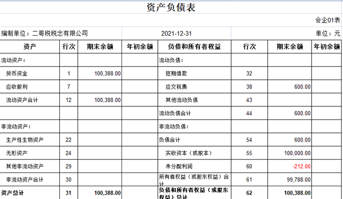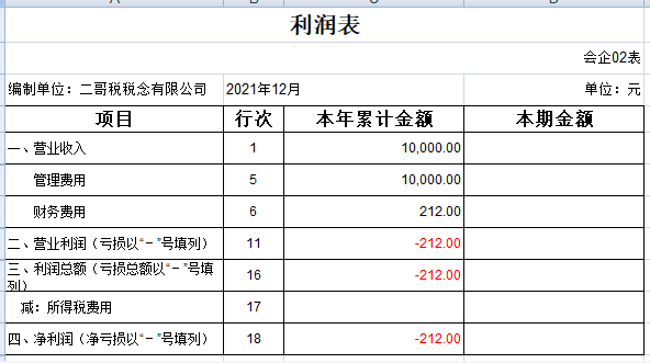 从报表简单的看,2021年亏损212(10000-10000-212),资产负债表未分配利润也是212。业务非常简单。