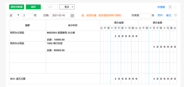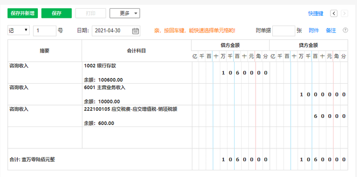 5、我们再模拟一个月的业务(4月)让报表稍微丰富一些,4月取得一笔咨询收入,分录如下: