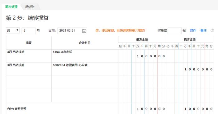 4、3月结账,期末点击结账,自动生成结转凭证,一个字方便!如果不结转会出现什么情况,那你利润表的数据就不会转移到资产负债表(本年利润去),你资产负债表就不平!
