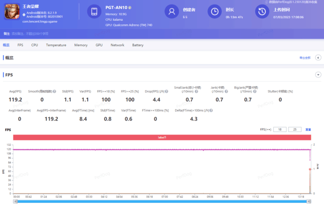 《王者荣耀》游戏内开启高清画质+极高帧率(120Hz),测试环境为5V5排位赛,在进入对局之后正式开启Perfdog录制。不论是在对线期,还是后期激烈的团战场景,画面都没出现丝毫卡顿,实测平均帧率为119帧,骁龙8 Gen2芯片的性能可以说是随便拿捏《王者》。