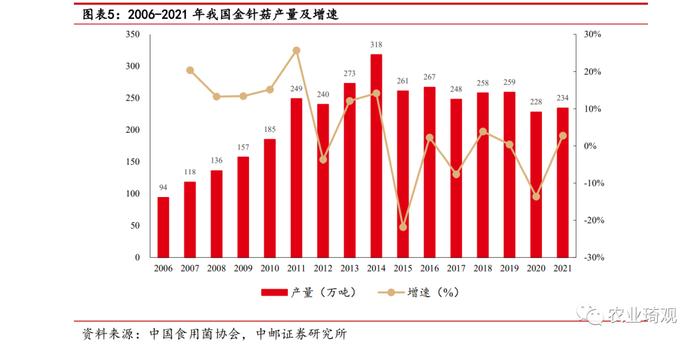 我国食用菌年产量占世界总产量的75%以上。2021年全国食用菌总产量为4189.25万吨,2014-2021年年均复合增速达3.14%。其中,金针菇是我国第五大食用菌品种,其产量相对较为稳定,2021年约为234.37万吨,同比增长2.76%。