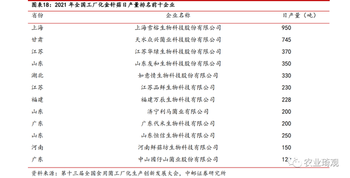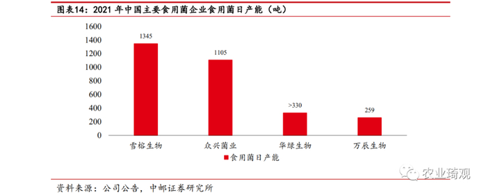 公司是全国最大的金针菇生产企业。截止至2021年底,公司金针菇日产能为1050吨,行业产能第二的为众兴菌业,其金针菇日产能为745吨,其次依次为华绿生物(超过330吨)、万辰生物(231吨)等。在2021年全国工厂化金针菇日产量排名前十的企业中,公司排名第一。