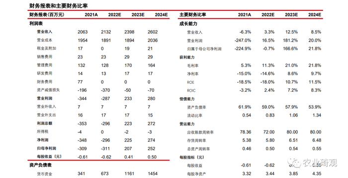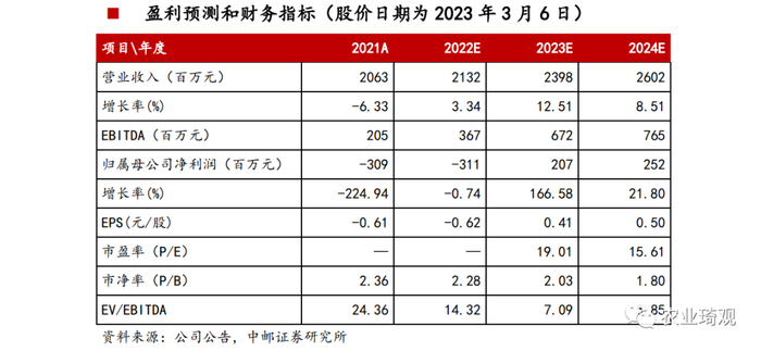 综上所述,公司业绩将从2023年开始全面好转。我们预计2022-2024年公司营业收入分别为21.32亿、23.98亿和26.02亿,2022-2024年将分别实现归母净利润-3.11亿、2.07亿和2.52亿。