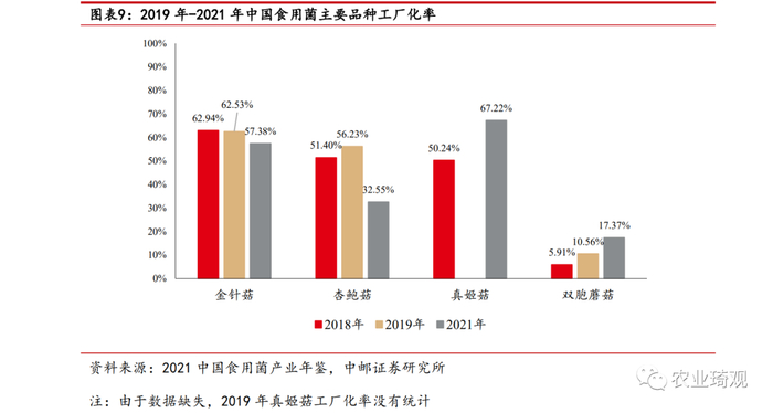 不同品种间工厂化差异大,金针菇、杏鲍菇、真姬菇工厂化率高。当前国内外实现工厂化生产的食用菌主要有金针菇、真姬菇、杏鲍菇、双孢蘑菇等。根据统计,2021年金针菇、杏鲍菇和真姬菇的工厂化率均超过50%。金针菇2021年工厂化率为52.54%,与2018年、2019年变化不大。杏鲍菇2021年工厂化率为32.55%,较2019年下降了23.68%。真姬菇(白玉菇、蟹味菇、海鲜菇统称为真姬菇)2021年工厂化率为67.22%。双孢蘑菇由于单吨投资额大,故当前在国内发展较慢,工厂化率一直不高,但工厂化率整体呈上升趋势,从18年的5.91%上升到21年17.37%。