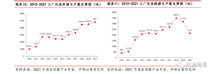 金针菇行业集中度持续提升。金针菇工厂化生产技术已非常成熟,众多小企业难以维持而退出市场,而大企业则趁势提升产能。我国工厂化金针菇日产能2010年仅为988.9吨,2021年已高达4807吨,年均复合增速为14.08%。同时2021年金针菇CR10从2019年的66%提升至2021年的83.69%,行业向龙头集中的趋势明显。