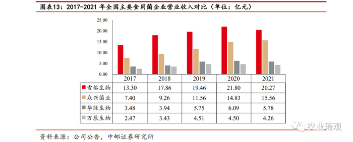 食用菌最大的上市公司。食用菌行业主要有雪榕生物、众兴菌业华绿生物万辰生物四家上市企业,其中雪榕生物是营业收入规模最大、产能最大的企业。据统计,2017-2021年雪榕生物的营业收入远远高于其他三家上市公司,稳居行业前列。公司食用菌日产能1345吨,位于国内同行业之首。