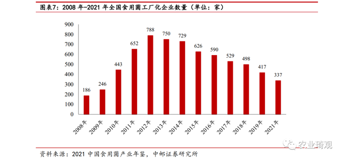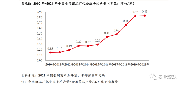中小企业逐步退出,企业生产规模扩大。截止2021年12月,全国食用菌工厂化生产企业共有337家,企业数量相比2019年417家减少了80家(2020年因疫情原因没有统计),降幅为19%。随着企业数量减少,我国食用菌工厂化企业平均产量在不断提高,由2010年的0.15万吨提升到2021年的0.83万吨。