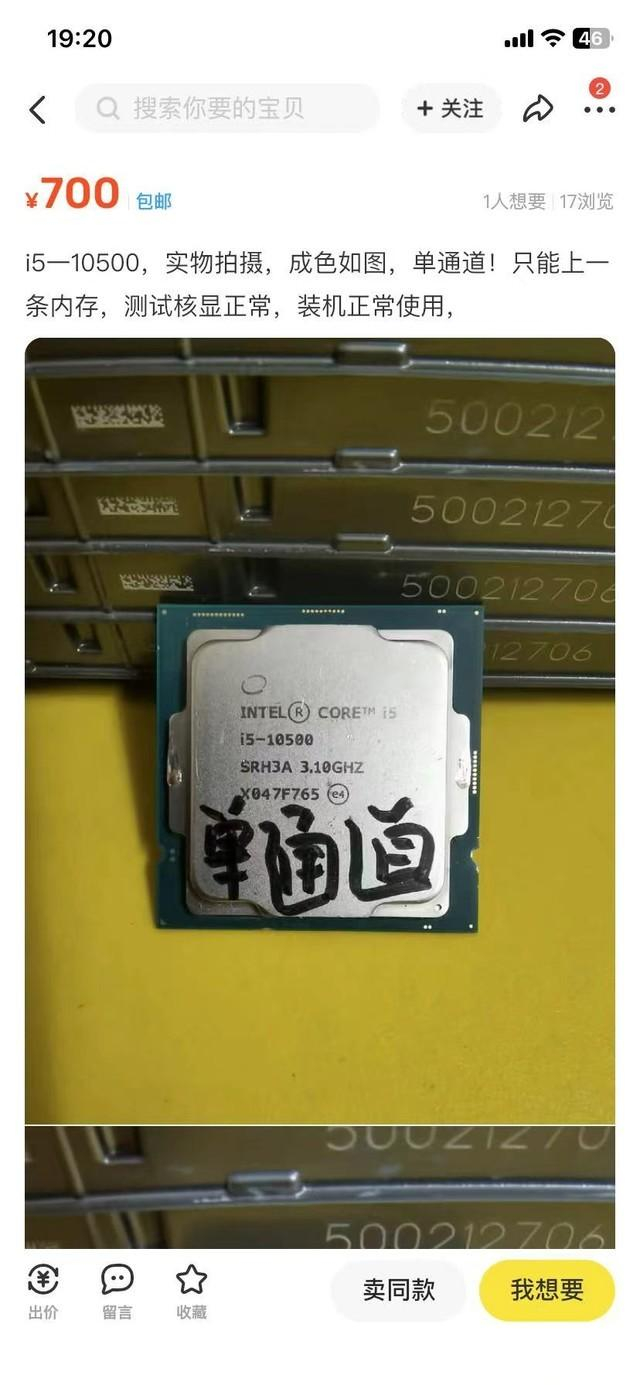 例如我们搜索10代酷睿i5 10500这款CPU,就会有很多种结果,根据卖价的不同,还会有单通道版、无核显版、正显版等,这都是什么情况?先说无核显版,指的并不是带有F后缀的产品,而是标准的10500,但是核显无法输出显示信号。由于CPU是高度集成的,因此所谓无核显版,当然就是核显坏了呀。