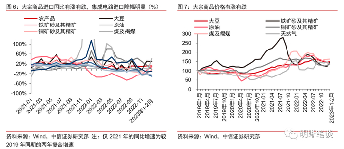 为何进口明显低于预期?尽管PMI等高频数据显示年初内需修复明显,但进口同比增速明显低于预期,我们认为主要有三个原因:(1)大宗商品方面:内需改善下,部分大宗商品进口有所修复,但全球能源品价格整体有所回落,过去由价格因素支撑进口金额的大宗商品,如原油、天然气仍呈环比负增长。(2)地缘政治因素扰动下,我国机电产品与高新技术产品的进口大幅收缩,机电产品、集成电路、高新技术产品进口同比降幅明显,压制了整体进口表现。(3)去年1-2月我国进口仍旧维持较高增速,因此今年1-2月进口的同比表现也受到了去年同期高基数的影响。