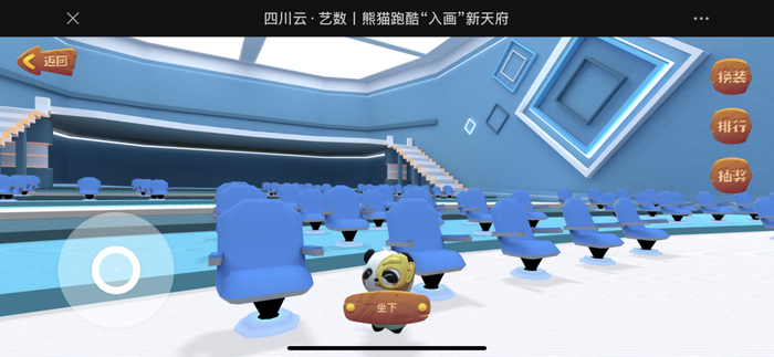 化身熊猫,场景漫游。全新四川云·艺数平台为你提供高度自由的游戏体验,化身一只软萌的大熊猫在虚拟场景中漫步,去探索云剧场、云博物馆、云新闻中心、云展览、云艺术村5大场馆,同时,你还可以在场馆中选择心仪位置坐下观演。除此之外,四川云·艺数平台还将在不同节点推出限定点位等你解锁。