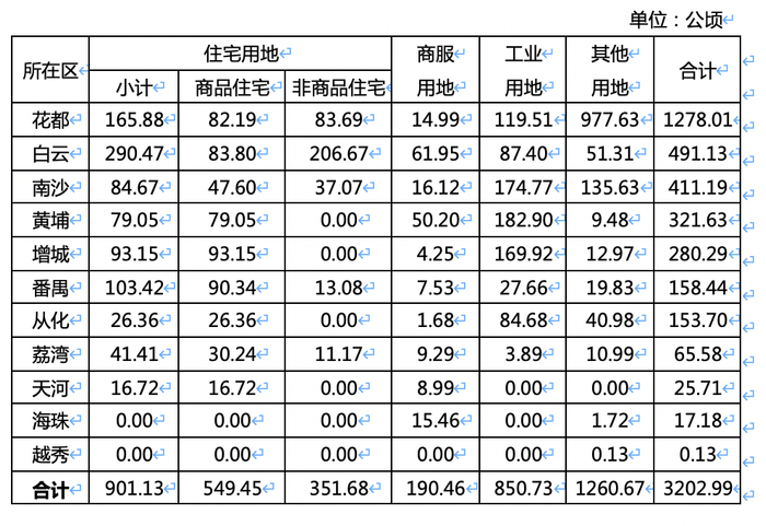 按照《计划》,广州今年建设用地供应总量为3203公顷,包含住宅、商服、工矿仓储、其他用地等用途。