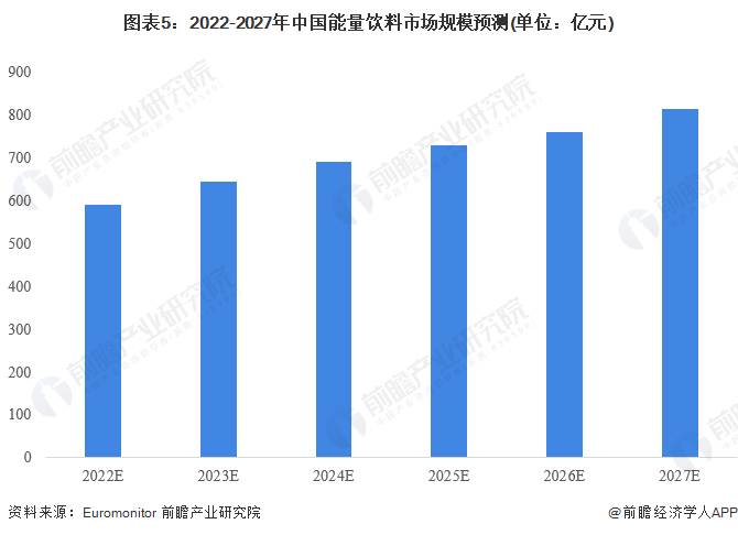 随着游戏电竞、音乐节等活动兴起,新的消费场景更加符合消费年轻化的趋势,能量饮料的口味和面向群体、场景的转变也将带来更多的市场机会,未来能量饮料市场将进一步扩大。前瞻预计,到2027年,我国能量饮料市场规模将达到815亿元。