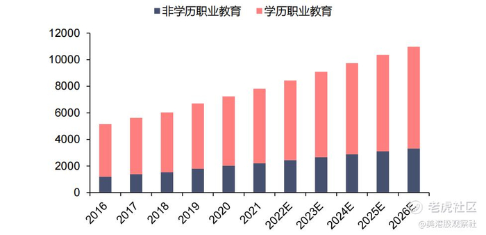 目前,我国正处于第一产业向二、三产业升级的进程中,需要大量的技术性人才,相应的职业技能培训的需求也非常旺盛。根据弗若斯特沙利文的数据,我国的职业教育行业的市场规模从2016年的5,167亿元增加到了2021年的7,811亿元,年复合增长率达到8.6%,而且预计到2026年将会超过1万亿元。