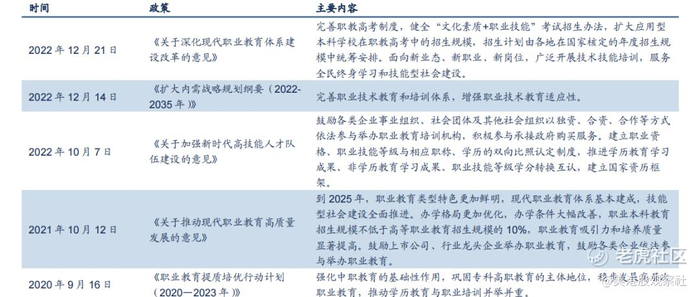 我国对职业教育也保持着一贯支持的政策,2020年9月发布了职业教育提质培优计划,推动学历教育和职业培训并举并重,在2022年的扩大内需规划中,也明确表示要完善职业技术教育和培训体系。2022年年底更是发布了《关于深化现代职业教育体系建设改革的意见》,对职业教育的发展提出了明确的鼓励政策。