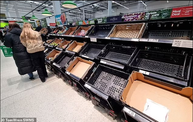 拍摄于英国西南部城市布里斯托尔菲尔顿的阿斯达连锁商超图片显示,英国的超市正在限量配给西红柿、黄瓜、辣椒、生菜和鸡蛋。包括覆盆子在内的各种浆果,商店里也很难买到。