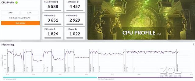 3DMark CPU Profile通过物理特效渲染来评估CPU的单线程和多线程性能,实测酷睿i7-1360P处理器单线程得分1022,2线程得分1826,4线程得分2929,8线程得分3651,16线程得分4457,最大线程得分5588,总体性能实力优异。