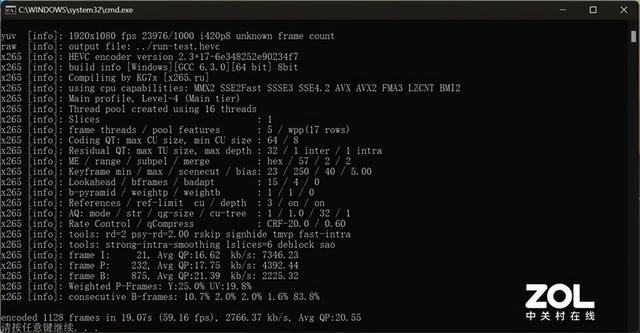 在日常应用中,视频编码对处理器性能要求比较高,我们来看看H.264和H.265编码性能表现。X264 Benchmark测试标准下,完成2500 frames编码耗时仅43秒,帧率高达58.8fps;在H.265测试中,耗时19.07秒,帧率为59.16fps,编码效率还是可以的,满足一些较重负载视频编码任务没有任何压力。