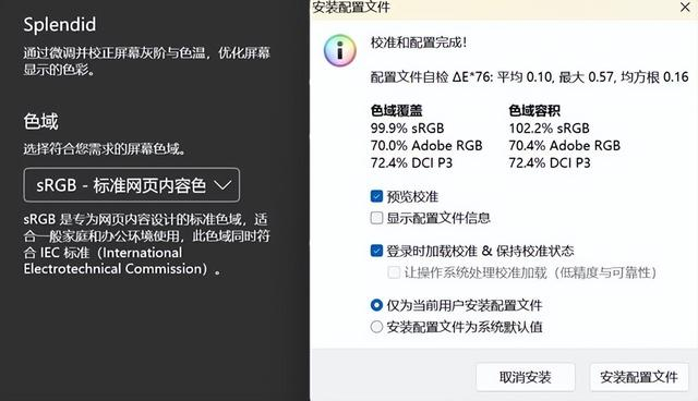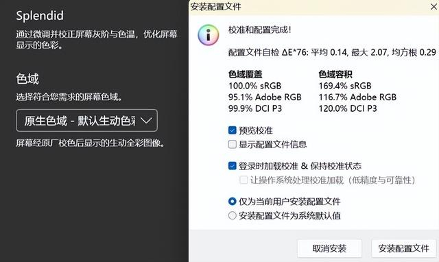 首先在原生色域模式下,灵耀14 2023这块屏幕的sRGB色域覆盖为100%,色域容积169.4%;DCI P3色域覆盖为99.9%,色域容积120%。