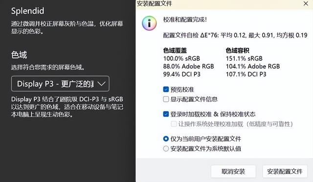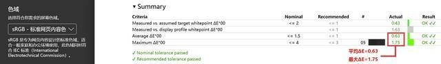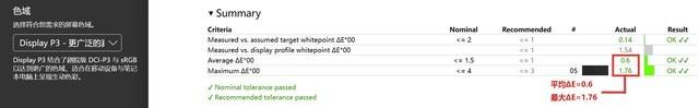 sRGB色域模式,色准ΔE平均值为0.63,最大值1.75;Display P3色域模式,色准ΔE平均值为0.6,最大值1.76,总体表现出色,色彩还原可以说是非常准确。