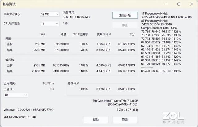 压缩与解压缩在日常办公应用中会频繁涉及,不只是打包与解包,几乎所有软件后台运行都会做压缩与解压缩的工作。通过7-Zip测试可以看到,完成10轮测试耗时85.781秒,压缩速度达到57358KB/s,解压缩速度达到743479KB/s,总体评分为65.819GIPS,压缩与解压缩性能表现很给力。