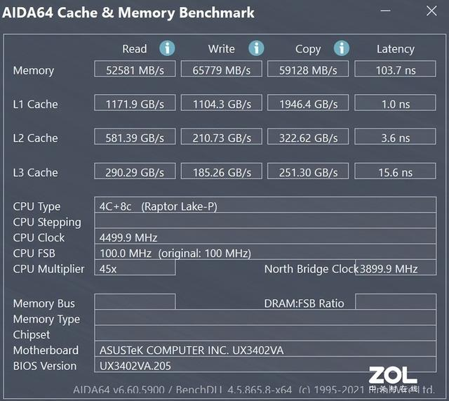 灵耀14 2023板载双通道16GB LPDDR5 4800MHz高频内存,充分释放集成显卡的性能,让创意设计不限速。通过实测可以看到,内存读取速度达到52581MB/s,写入速度65779MB/s,拷贝速度59128MB/s,延迟103.7ns。从速率上看,标准的16GB LPDDR5 4800MHz高频内存运行速度值得称赞。