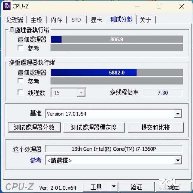 参考CPU-Z的单核与多核性能测试,实测其单核性能达到805.9,多核性能达到5882.0,从跑分测试可以看到,这颗处理器单核和多核性能表现都很不错,可以轻松胜任各类日常办公应用,而且灵耀14 2023也将这颗处理器的性能发挥的非常不错。