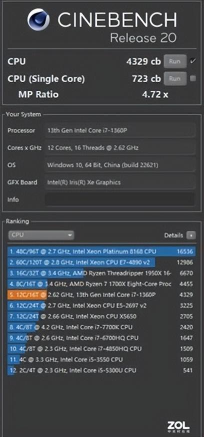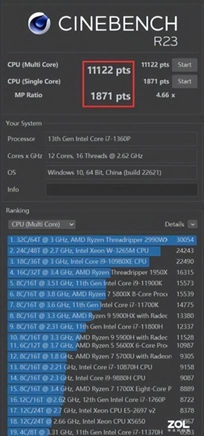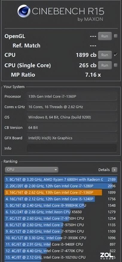 另外得益于i7-1360P处理器出色的多线程性能,对于使用笔记本进行多线程任务应用的用户而言,这一定是一个好消息。在CINEBENCHR15中的成绩为单核265,多核1899,R20单核多核成绩分别为723和4329,R23中分别为1871和11122,这个成绩在目前在售的轻薄型笔记本中属于前列,完全可以支撑你的个人创作。在运行一些创作类软件的时候,它都能够很好的支撑你的工作流程。